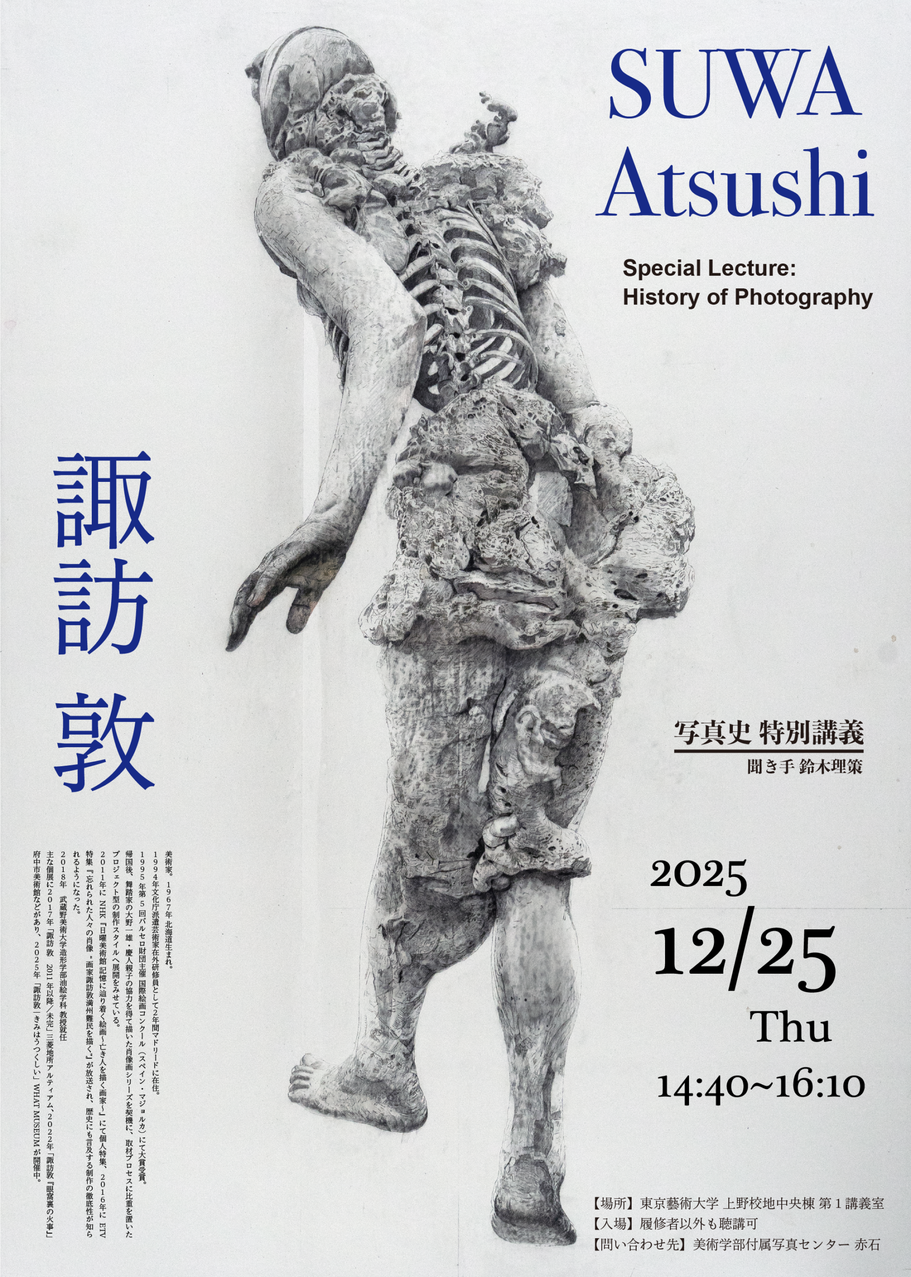 授業情報 写真史特別講義開催のお知らせ 投稿者: 写真センター更新日: 2025年12月18日2025年12月18日 写真史 特別講義 諏訪敦 聞き手鈴木理策 日時 12月25日(木)14:40~16:10場所 東京藝術大学上野校地 中央棟 第1講義室